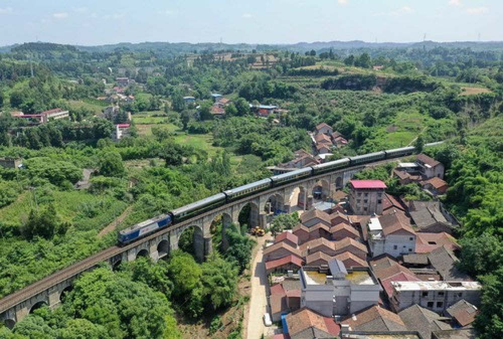 ▲成渝铁路王二溪大桥采用了中国传统的石拱桥建造技术,成为国内少有的铁路石拱桥(6月13日无人机拍摄)。新华社记者薛玉斌摄