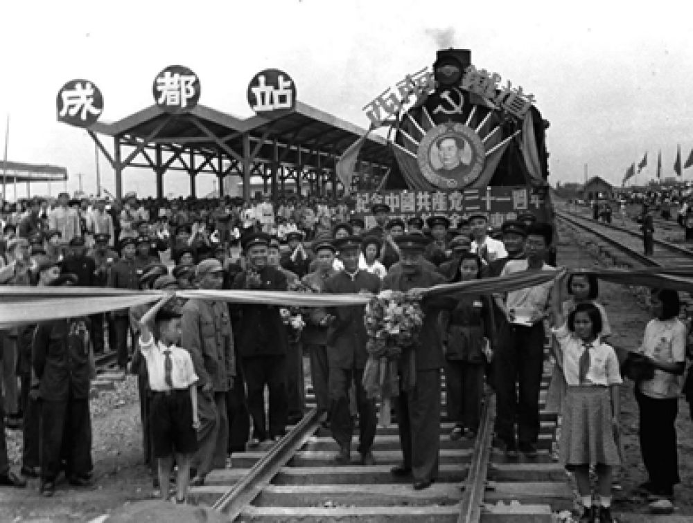 ▲1952年7月1日,新中国第一条铁路成渝铁路建成通车,图为西南军政委员会副主席贺龙在通车典礼上剪彩。