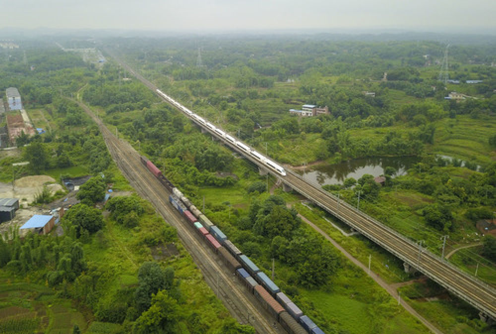 ▲在成渝铁路峰高铺站,成渝铁路(左)和成渝高速铁路双线并行在一起(6月12日无人机拍摄)。新华社记者刘潺摄