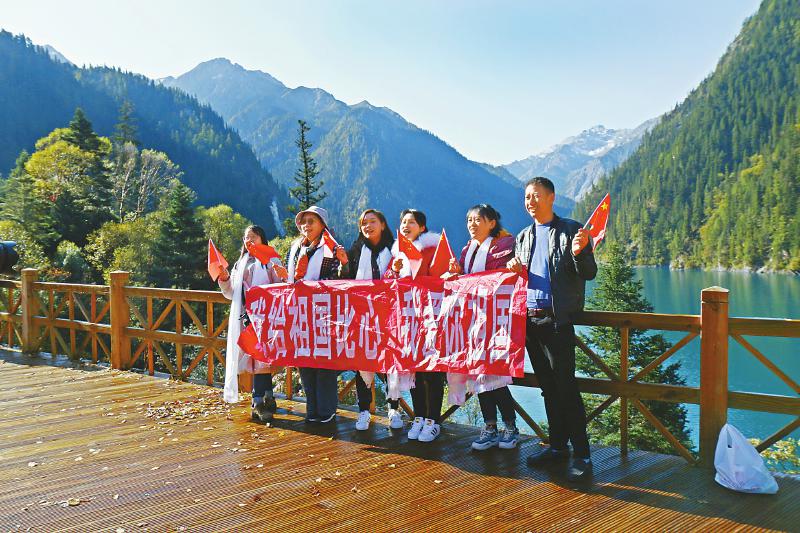 阳光下,游客说着笑着,呼朋引伴。来自山西太原的李凤英和几位同伴穿上艳丽的民族服装,牵着横幅拍照,她们齐喊:“我在九寨沟祝福祖国繁荣富强。”她们感叹,九寨沟景色太美了,不虚此行。