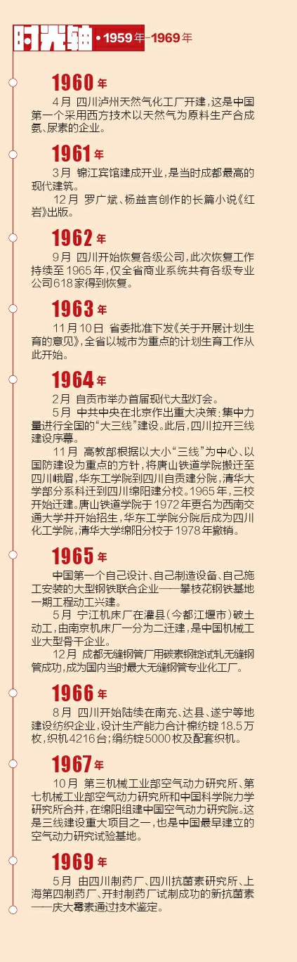 这一年,晨光化工研究院在富顺县建立,由北京化工研究所、上海化工研究院、上海医药工业研究院、沈阳化工研究院等科研单位的部分机构组建;化工部第八设计院在成都成立,由大连化学工业公司研究院、锦西化学工业公司设计研究院的设计部分合并组建;西南化工研究院成立,前身是1958年8月建立的化工部化工设计院西南分院。