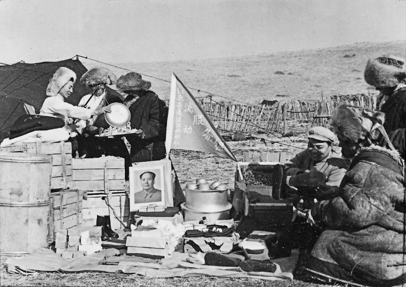 1972年6月,红原县麦洼区供销社组织牦牛流动商店深入夏季牧场为牧民群众服务。