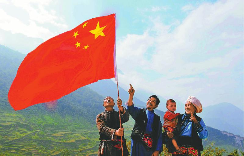 2009年,新中国成立60周年之际,汶川县雁门乡萝卜寨村的三位村民在山上升起一面鲜艳的五星红旗,感恩伟大祖国。
