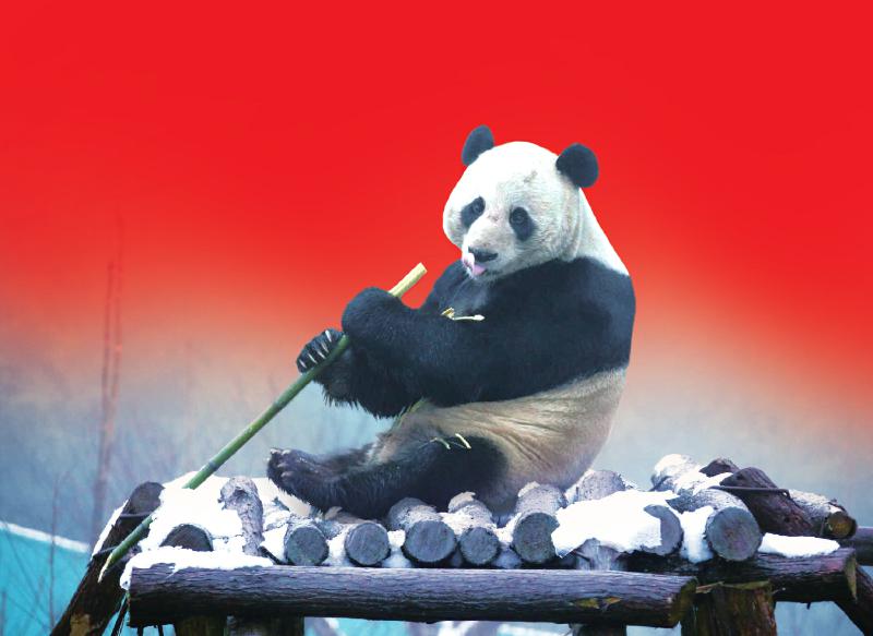 2019年1月6日,在雪后放晴的广安市华蓥山大熊猫野化放归培训基地,大熊猫“云涛”正萌萌地食用竹子。
