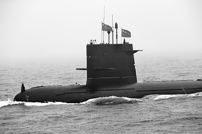 庆祝中国人民解放军海军成立70周年海上阅兵活动在山东青岛附近海空域举行。中国海军某新型潜艇接受检阅。光明图片/视觉中国