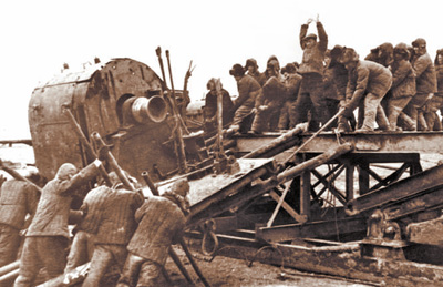 大会战时期,王进喜(中)和钻井工人们人拉肩扛运钻机,保障钻井作业。资料图片