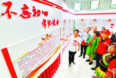 2019年9月23日,河北秦皇岛档案馆工作人员和海港区红旗里社区共同举办“与祖国同行 向梦想出发”活动,邀请社区居民参观市档案馆的“不忘初心,牢记使命”——国旗、国徽、国歌档案展,参加快闪齐唱歌曲,为祖国送上祝福,共同庆祝新中国成立70周年。视觉中国/光明图片