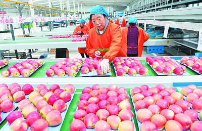 河南省洛宁县把“金果扶贫”作为产业扶贫的重要抓手,通过苹果产业帮助贫困户脱贫。图为该县上戈镇一家企业内,工作人员在分拣苹果。新华社发