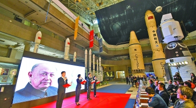 在我国第四个“中国航天日”,人民科学家钱学森专题展在北京中华航天博物馆开幕。图为志愿者在钱学森专题展开幕式上朗诵诗歌。新华社发