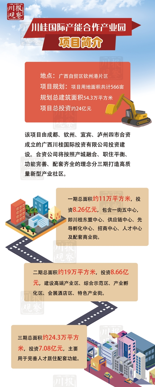 林海波介绍,项目将按产城融合、职住平衡、功能完善、配套齐全的理念打造高质量新型产业社区,包括川桂东盟中心、供应链中心、先导孵化中心、配套商业街等。项目远期还将逐步拓展至钦州港川桂临海产业园5平方公里区域,成为区域供应链总部、贸易企业总部、加工企业总部。
