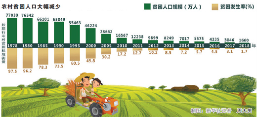 以现行标准衡量,1978年末我国农村贫困发生率高达97.5%,农村贫困人口7.7亿人,而截至2018年底,只剩下1660万人未脱贫。2013—2018年6年来,农村累计减贫8239万人,连续6年平均每年减贫1300多万人。“中国贫困人口的减少规模和速度是人类历史上绝无仅有的。”中国人民大学中国扶贫研究院院长汪三贵说。