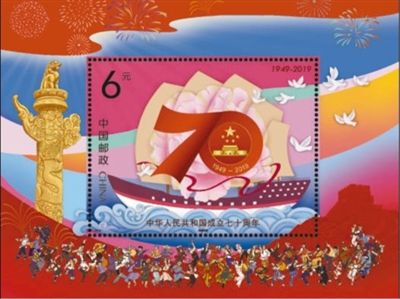 为庆祝新中国成立70周年,国庆纪念日当天,中国邮政发行一大套纪念邮票。一组邮票以“五位一体”总体布局为主题,深刻表现全面建成小康社会的战略决策;一枚小型张(见图二)则重点表达各族人民对新中国的衷心祝福,烘托举国同庆的节日气氛。