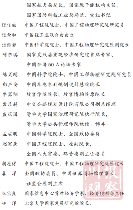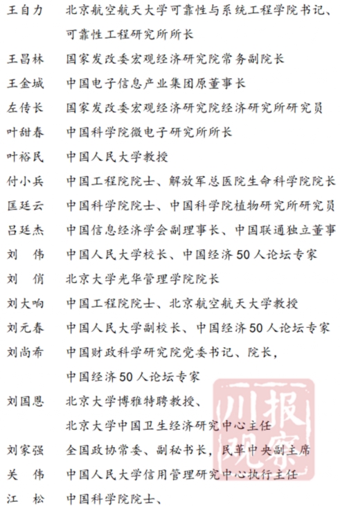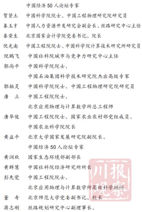 44名同志中,省部级领导10人,中国经济50人论坛专家6人,“两院”院士8人,其他高端智库专家学者20人,涉及政治、经济、文化、社会、生态等领域,涵盖了宏观经济、产业经济、区域经济、数字经济、科技创新、对外开放、基础设施、金融财税、文化旅游、“三农”工作、乡村振兴等方面。