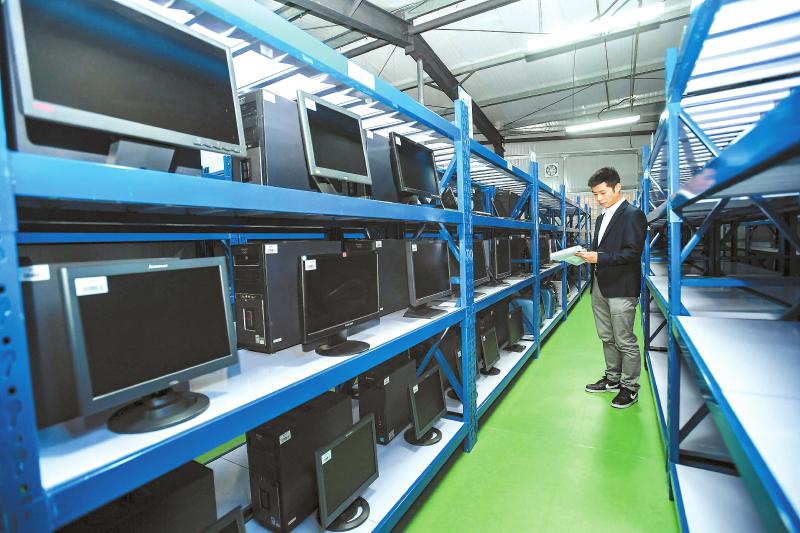 10月29日,工作人员在对省级机关国有资产处置服务平台仓库内的待处置电子设备进行清点。 本报记者 郝飞 摄
