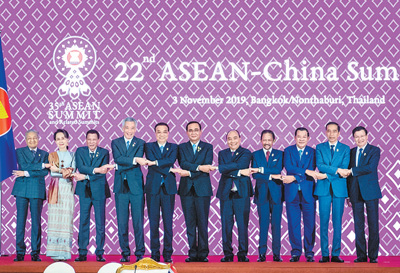 与会东盟国家领导人祝贺新中国成立70周年,认为东盟—中国关系是东盟伙伴关系中最具活力的一组关系,充分肯定过去一年双方合作取得的新进展,感谢中国支持东盟在区域合作中的中心地位,愿积极参与共建“一带一路”,拓展互联互通、科技创新、电子商务、智慧城市、蓝色经济等领域合作,扩大双向投资,争取双方贸易额早日突破1万亿美元,共同维护多边主义和自由贸易。各方积极评价“准则”磋商取得的积极进展,愿继续保持势头,推进磋商进程,共同维护地区和平稳定,促进地区发展繁荣。