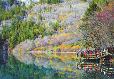 11月7日,九寨沟景区内艳阳高照,风景醉人。九寨沟景区于今年9月27日恢复开放85%的区域,震后“补妆”归来,美丽依旧。 新华社记者李梦馨摄