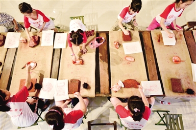 安徽合肥蜀山区半岛新村社区的小朋友在体验拓印技艺,感受传统文化的魅力。葛宜年摄/光明图片