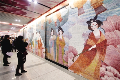 陕西西安地铁四号线大唐芙蓉园站,乘客在观赏文化墙《芙蓉赏灯》。梁萌摄 光明图片/视觉中国
