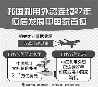 在一系列稳外资、优化营商环境措施的积极作用下,中国市场成为最受欢迎的投资热土之一。我国稳定、透明、可预期的外资法律法规政策环境,较完善的基础设施和产业配套,丰富优质的劳动力供给,吸引了大量外国投资者。从上海的特斯拉超级工厂、合肥的康明斯发动机项目到湛江的德国巴斯夫项目、宁波的瑞士英力士化工项目,外企来华投资兴业步履不停。数据显示,2018年中国实际利用外资1383亿美元,稳居发展中国家首位。