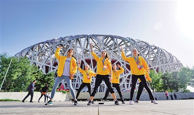 “汉语桥”少年选手们在鸟巢前欢乐起舞。光明图片