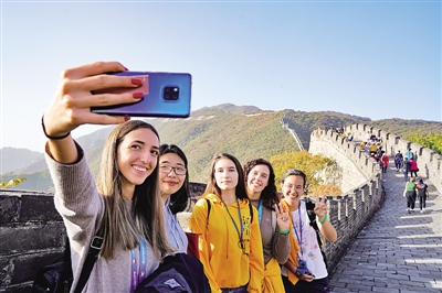 “汉语桥”选手在长城上拍照留念。光明图片