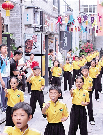 来自广州荔湾区五眼桥小学的学生在李小龙祖居门口表演岭南传统武术。吴伟洪摄 光明图片/视觉中国
