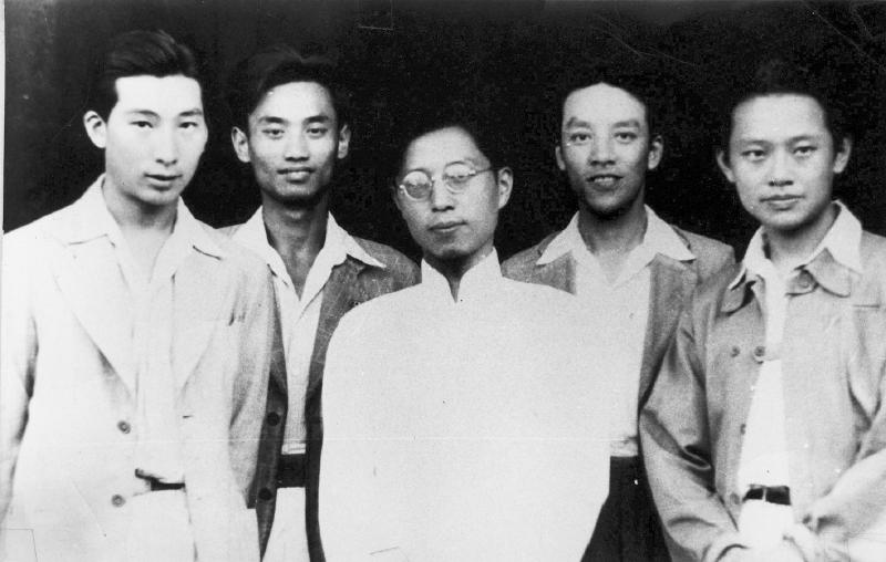 1941年曹禺与剧专同学(《反间谍》编剧组)在江安合影。从左至右:钟锄云、陶熊、曹禺、范启新、冉英。