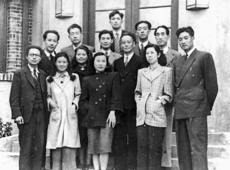 剧专第九届表演专科毕业生1948年于南京与校长等合影。校长余上沅(二排左四)、阎哲吾教授(二排左一)。