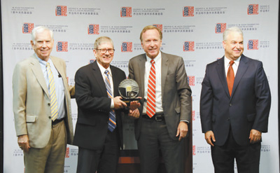 图为6月12日,尼尔·布什(左三)在亚特兰大为美国前总统卡特颁发首届美中关系卓越领袖奖,其子詹姆斯·卡特(左二)代为领奖。本报记者 张梦旭摄