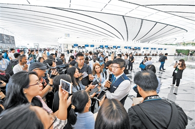 媒体记者走进北京大兴国际机场,了解报道机场综合交通体系的构建情况。新华社发