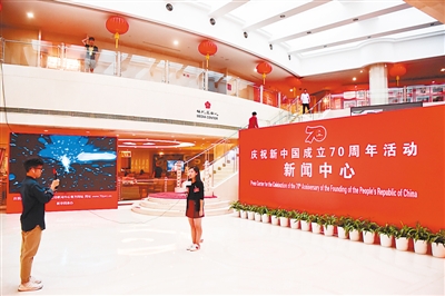 庆祝新中国成立70周年活动新闻中心,媒体记者在进行采访报道。新华社发