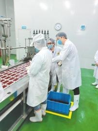 海关人员正在巧丫巧食品的鸭血生产车间进行监管。 成都海关供图