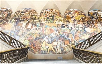 修建于16世纪的国家宫,曾是不同历史时期统治者的宫殿和执政中心,见证了墨西哥权力的更替。穿过生长着仙人掌与龙舌兰的花园、广阔的中庭,顺着楼梯拾级而上,映入眼帘的便是里维拉绘制的巨幅壁画《墨西哥的历史》。这里时常可以看到众多师生的身影。学生们整整齐齐地坐在层层楼梯上,一边静静聆听老师的讲解,一边仰着头满怀敬仰地注视着墙壁上的作品。面对如此震撼人心的画面,历史不再是书本上单薄的文字,而是画面中神圣的太阳和月亮金字塔,是印第安奴隶眼中的泪水,是民族斗士们手中的武器,是人们取得胜利后的喜悦。