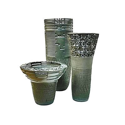 其二,作品跳出传统、现代与后现代的窠臼,不再简单追随西方的艺术流派,也不再拘泥传统,初步形成了新时代中国风格的陶艺表现形式,激发了独特的艺术生命力。熊开波的《鼎兴中华》从最古老的艺术元素中汲取营养,其美学渊源来自彩陶时期的三足器和殷商时期的青铜器,结合个人审美和陶艺语言进行改造融合,整件作品饱满、新颖而富有历史意韵。吴建毅的《器之欲》将传统容器用抽象的雕塑结构和理念来表现,作品中间的盘子在材质处理上极为精细用心,容器的精致与雕塑粗糙的质地形成互补。梁冰的《远古的痕迹》从民间剪纸和古代玉璧中获得艺术灵感,这件作品的审美表达质朴、率真,泥土呈现的烧成方式像金属一样有力量感,作品纯朴的刀法也反映了作者长期感知泥土的能力。张辉的《裂·变》采用新的拉坯方式,重塑源自中国新石器时代的黑陶,使其表面出现裂纹,再用刀切镂空装饰,并细细打磨发亮,整件作品既传统又现代。