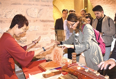在土耳其伊斯坦布尔举行的“一带一路”上海非物质文化遗产精品展上,参观者(右)在体验木版水印工艺。新华社发