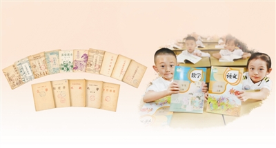 图左为第一套人教版统编教科书,右为小学生使用统一部编本教材。