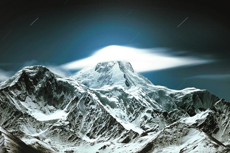 今年4月17日,甘孜州康定市甲根坝乡雅哈垭口,一场暴风雪后,贡嘎山迎来宁静的夜。晚上10点,一朵似礼帽的棉花云戴在贡嘎山头。此刻皓月当空星光流动,深蓝色的天幕下,贡嘎褪去白日的锋利,在庄重间尽显温柔……这一幕,被“90后”成都小伙陈成收入自己的镜头,并取名为《国王的礼帽》。