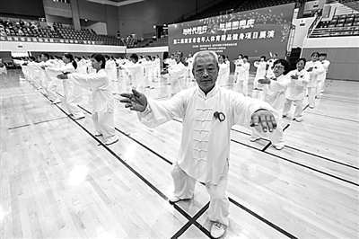 南京举行老年人体育健身项目展演,图为老人们正在表演太极拳。新华社发
