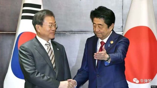 安倍和文在寅都很有感觉,都很高兴地掉起了书袋。