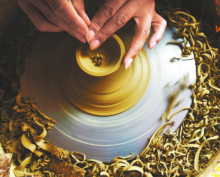 飞转的泥坯上折射出金色的光芒,学员刻苦学习拉坯的技艺。