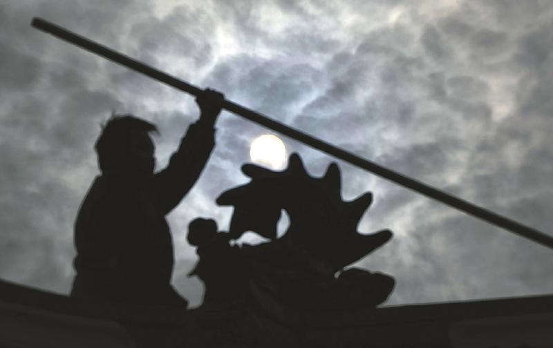 这是一名工人正在屋顶上工作,身后的太阳清楚的能见到缺了一个角。 本报记者何海洋摄