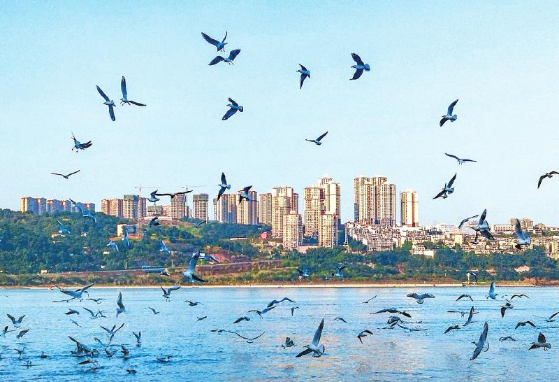 红嘴鸥在泸州江面嬉戏。 李峰摄
