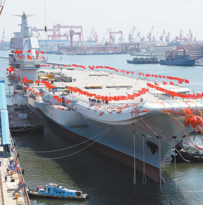 我国第一艘国产航母在大连造船厂码头下水现场图。新华社记者 李 唐摄