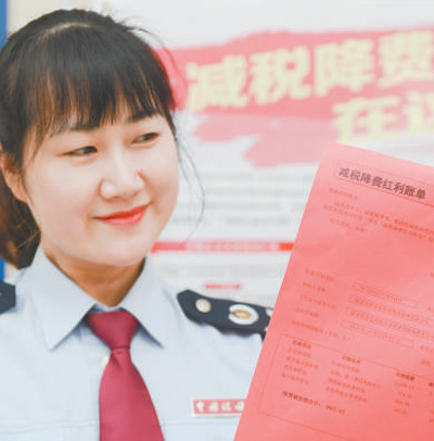 福建省泉州市惠安县税务局工作人员展示减税降费红利账单。 新华社记者 宋为伟摄