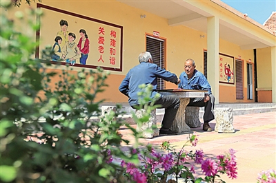 山东蒙阴县云梦湖生态区东汶社区的养老院中,两位老人在院子里下棋。新华社发