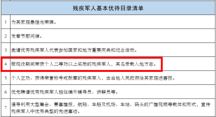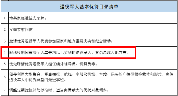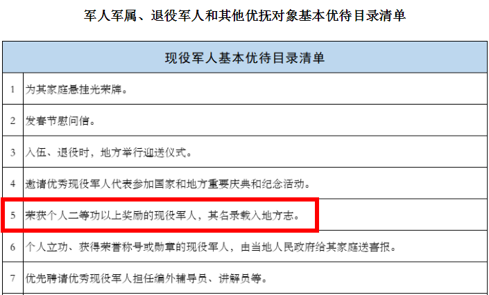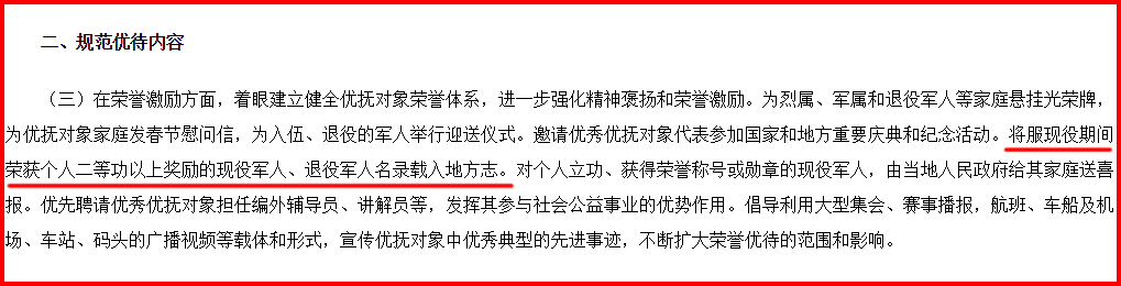 《意见》提出一系列创新举措。如,在荣誉激励方面,将服现役期间荣获个人二等功以上奖励的现役军人、退役军人名录载入地方志;对个人立功、获得荣誉称号或勋章的现役军人,给其家庭送喜报等。