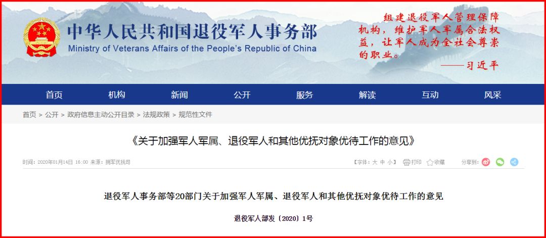 2020年1月9日,退役军人事务部、中央宣传部、国家发展改革委等20部门联合印发《关于加强军人军属、退役军人和其他优抚对象优待工作的意见》(以下简称《意见》)。