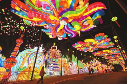 灯会采用传统灯组、现代光影秀、沉浸体验等方式综合呈现。其中,沉浸式场景“上元灯火”以盛唐街景追溯灯会起源,以彩灯打造一条长300米的市井古街,复现上元灯市的民风、民俗;“从长安到罗马”灯组群全长240米,如一幅美丽的“丝路画卷”。