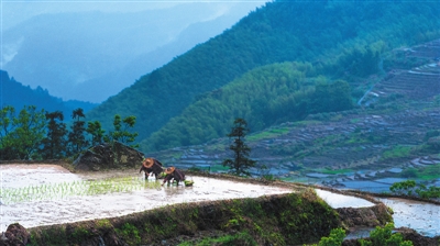 福建尤溪联合梯田依山开垦,垂直落差约600米。春天,给田里灌水;插秧时,种田埂豆、放鱼苗,田埂豆的根系能保护田埂,鱼能减少杂草和虫害的发生;收获时,放干田里的水,收鱼、收水稻、收黄豆;收获后,鸭子、山羊被赶入田中,觅食遗撒的谷粒和杂草,动物粪便、作物秸秆和豆类的固氮功能,不断提升土壤肥力。包世生摄