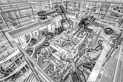 沈阳华晨宝马大东工厂车身车间,机械手臂在进行车身制造。新华社发